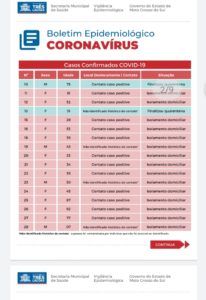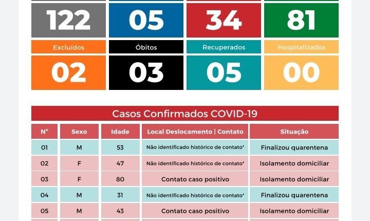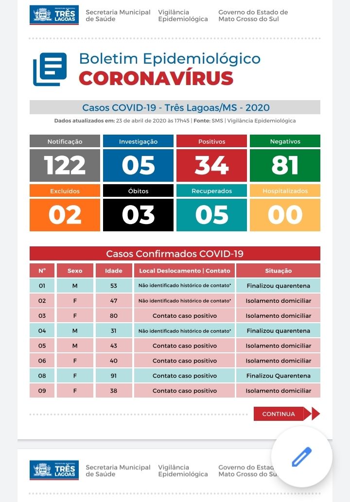 Até o momento, Três Lagoas possui 122 casos notificados, 05 estão em investigação após coleta de exame, 34 casos positivos para COVID-19, 81 negativos, 02 excluídos e 03 mortes.