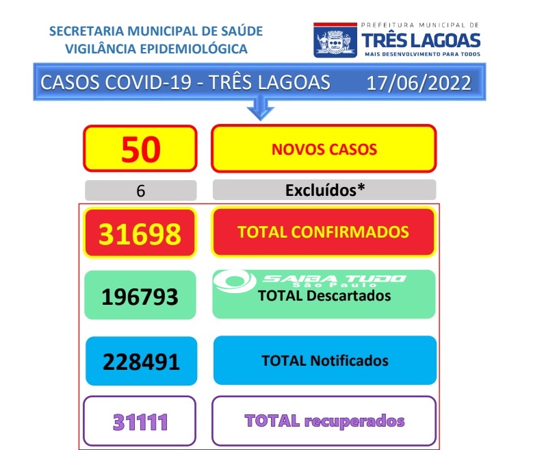A Prefeitura de Três Lagoas, por meio do setor de Vigilância Epidemiológica da Secretaria Municipal de Saúde (SMS), divulga o Boletim Covid-19.