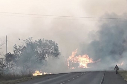 A carreta saiu da pista e a carga, bem como o caminhão foram totalmente incendiados, provocando grade nuvem de fumaça e ateando fogo também na vegetação.