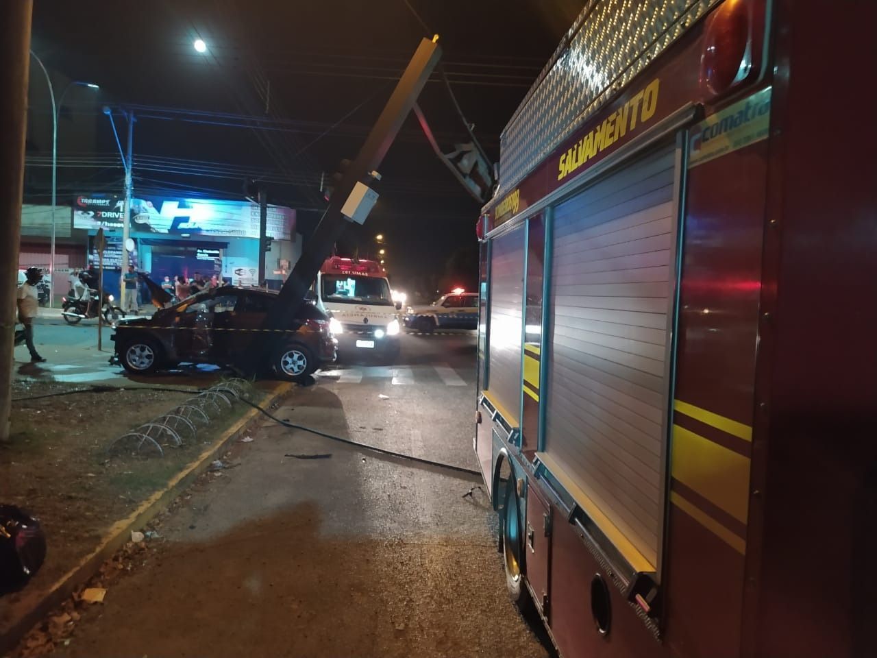 No local, existe um semáforo que ficou totalmente danificado, assim como os dois veículos – HB20 e motocicleta – tamanha a força da colisão.