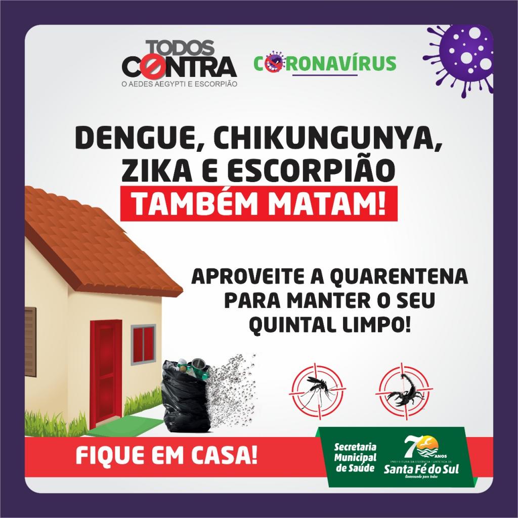 Apesar de todas as atenções estarem voltadas ao enfrentamento do novo coronavírus (Covid 19), a Secretaria de Saúde da Estância Turística de Santa Fé do Sul (SP) faz um alerta e lembra que o mosquito Aedes Aegypti e o escorpião não podem ser esquecidos.