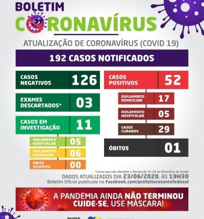 “É com grande pesar que a Secretaria Municipal de Saúde da Estância Turística de Santa Fé do Sul, comunica o primeiro óbito de um paciente atestado como positivo para o novo coronavírus (Covid 19).