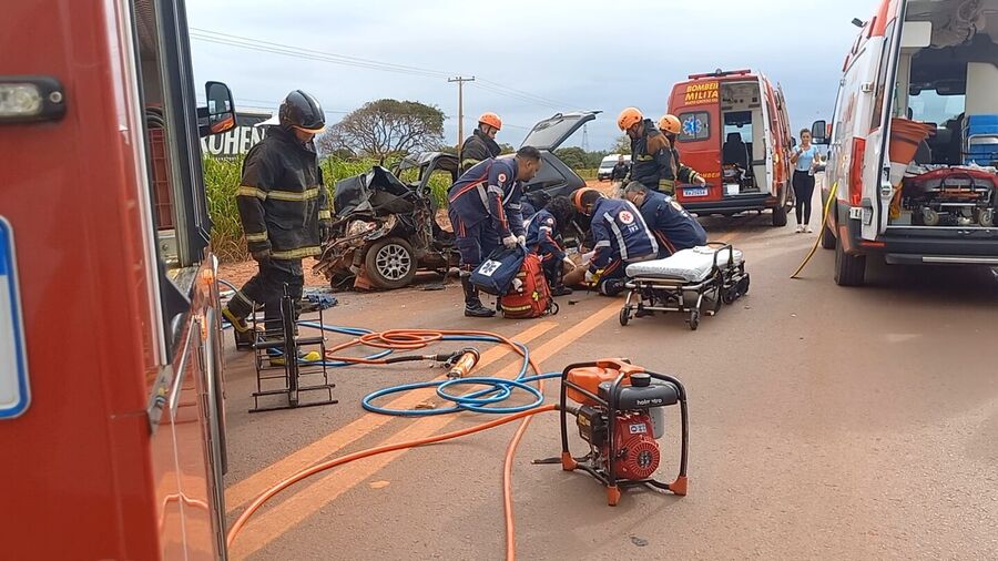 Enquanto a Polícia Militar ouvia a vítima de violência doméstica, o Corpo de Bombeiros era chamado para atender uma colisão frontal, entre um carro e um caminhão, nas proximidades do Chácara Imperial, na rodovia BR-262.